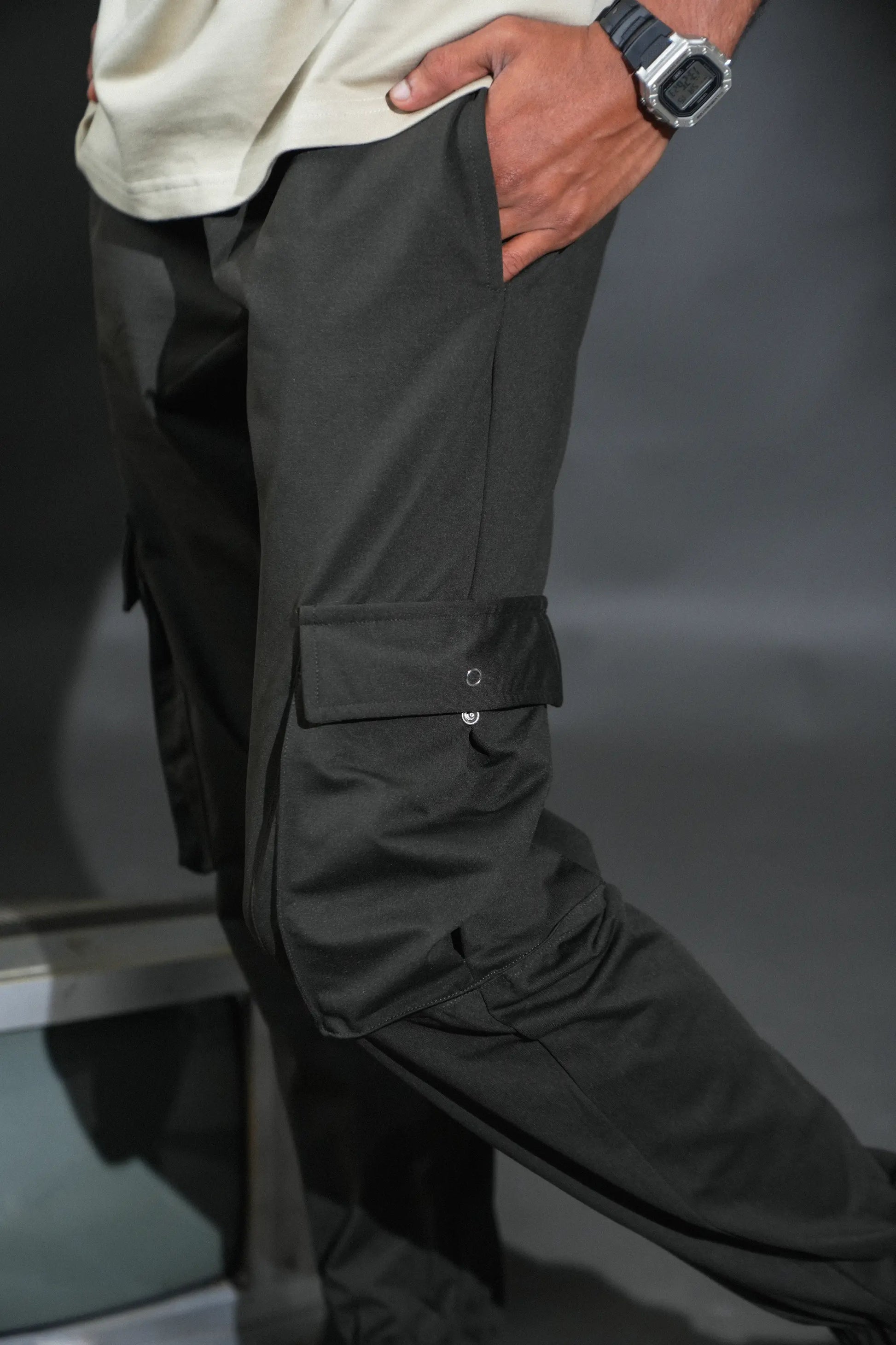 Olive unisex cargo joggers, combining style and relaxed fit comfort.